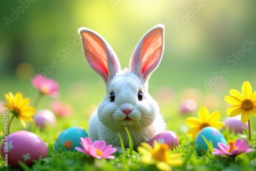Whimsical Easter bunny ears amidst a meadow of colorful flowers with scattered eggs, easter bunny ears, nature scene