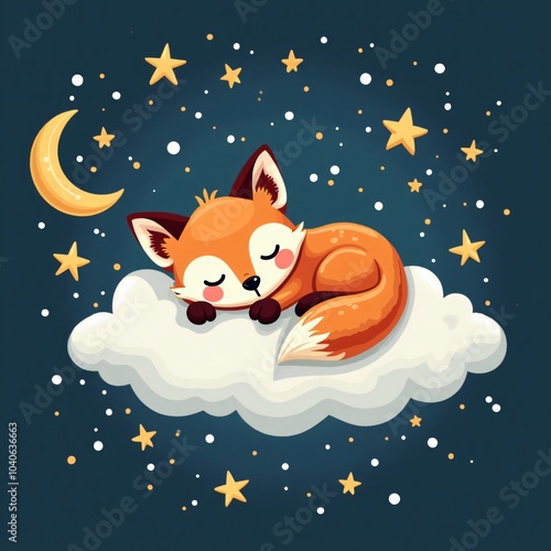 Whimsical Fox Sleeping on a Cloud with Stars and Moon