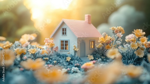 Whimsical Garden Inside House Frame with Red Cat on Balcony and Colorful Magic Elements