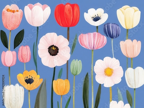 Whimsical garden Poppies and tulips in pastel hues dance against a vibrant blue canvas