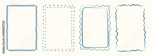 Whimsical hand drawn Italian postcard stamp set. Vintage Italy summer doodle border set. Minimal blue frames, mediterranean elements for menu, wedding, prints, invitation. Coastal Isolated Vector illu
