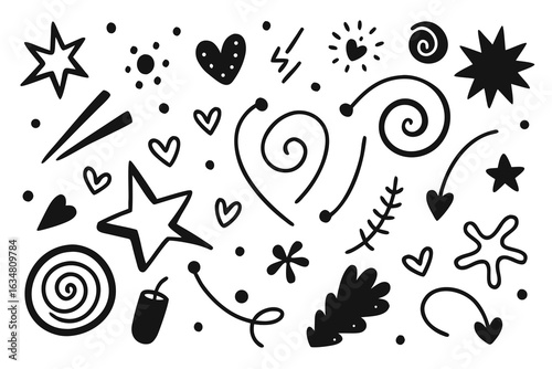 Whimsical hand-drawn doodle collection featuring stars hearts swirls and decorative elements perfect for adding playful charm to any design project instantly elevating visual appeal
