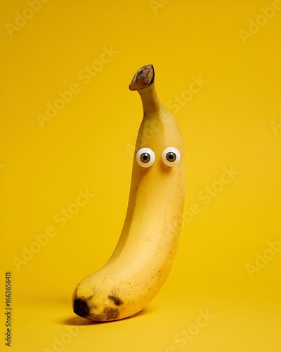 Whimsical Happy Banana Character with Googly Eyes Bright Yellow Background
