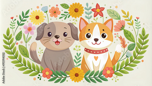 Whimsical illustration of a happy dog and cat together, surrounded by leaves and flowers, forming a circular symbol of friendship and pet-friendliness.