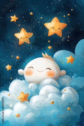 Whimsical illustration of a joyful child surrounded by fluffy clouds and smiling stars in a dreamy night sky.