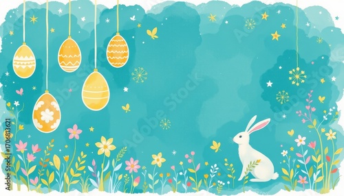 Whimsical illustration of a white rabbit with easter eggs enchanted garden digital art vibrant colors playful scene