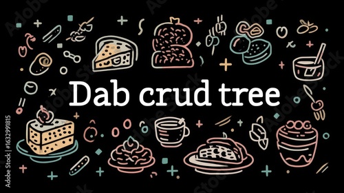 Whimsical line-art of diverse desserts on black, plus 'Dab crud tree' text in bold
