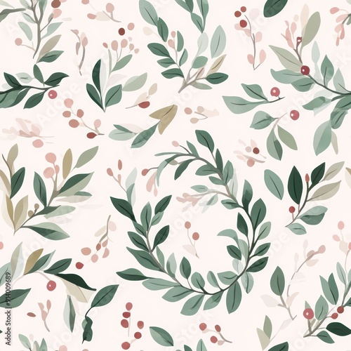 Whimsical Minimalist Watercolor Christmas Wreaths with Holly in Pastel Colors | Style: Kawaii, seamless pattern, Generative Ai