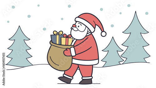 Whimsical santa claus carrying a sack full of presents through a snowy winter landscape with stylized pine trees and falling snowflakes