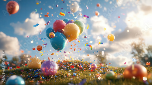 whimsical scene of colorful balloons floating above grassy field, surrounded by confetti and bright sky