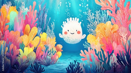 Whimsical Underwater Adventure: A Happy Fish Amongst Vibrant Coral Reef