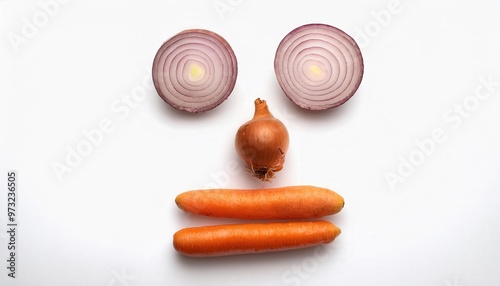 Whimsical Vegetable Face. Creative Composition of Sliced Red Onions, Black Olives, Whole Brown Onion, and a Carrot on White Background. Fun Representation of Food with Personality and Charm
