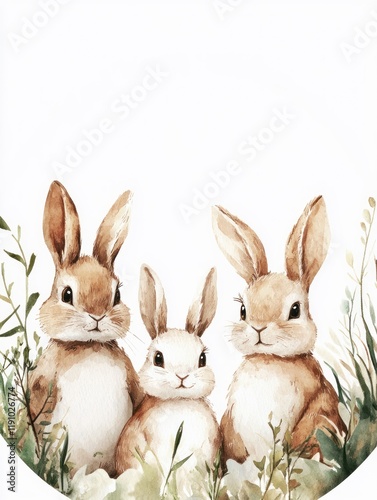 Whimsical Watercolor Rabbits Surrounded by Soft Greenery - Ideal for Minimalist Easter and Chinese New Year Celebrations