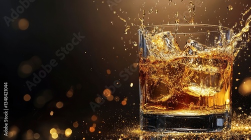 Whiskey Glass Splashing with Ice Cubes Against a Dark Background
