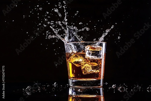 Whiskey Glass With Ice Cubes and Splashing Liquid on a Transparent Background