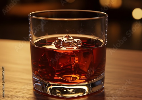 Whiskey in Glass with Ice Cubes on Wooden Table Surface