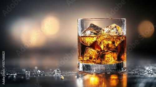 Whiskey on the rocks served in a clear glass with ice cubes against a dark background