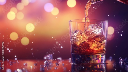 Whiskey Pouring Over Ice Cubes, Warm Golden Bokeh Background, Luxurious Indulgence