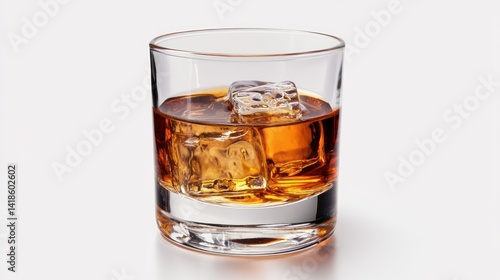 Whiskey rocks glass studio shot, ice cubes, white background, beverage advertisement
