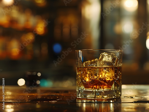 Whiskey with ice in a transparent glass. Neural network AI generated art