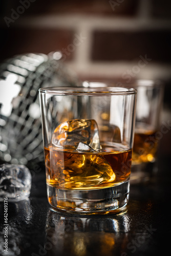 Whiskey with ice in glass on dark background, copy space