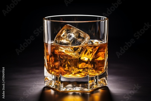 Whisky glass with golden liquor on black background, ideal for text placement and messaging