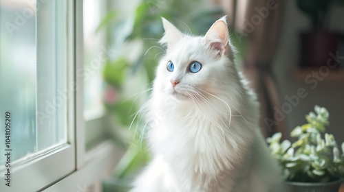White adorable cat with blue eyes sitting on a table and looking out of a window in the backdrop