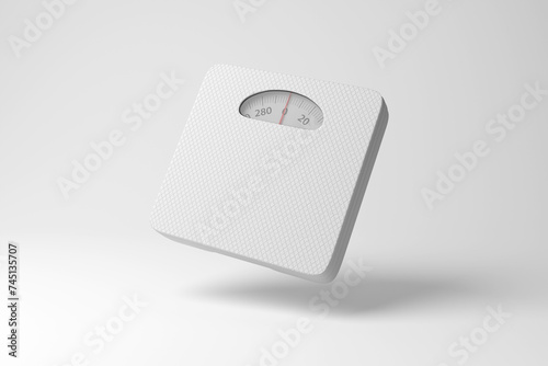 White analog weight scale floating in mid air on white background in monochrome and minimalism. Illustration of the concept of body mass index (BMI), diet and health