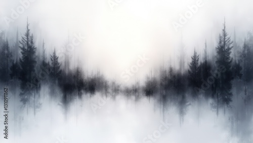 White and black abstract image depicting a misty forest with tall trees fading into the fog.