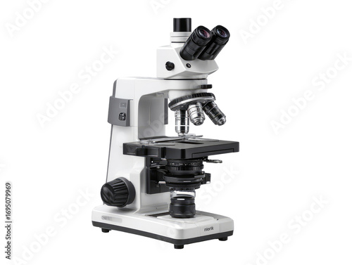 White and black compound microscope with binocular eyepieces. Precisely detailed laboratory equipment