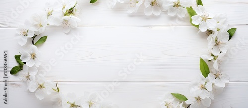 White apple flower circle on a white wooden backdrop with ample copy space for text positioned centrally creating a serene and elegant atmosphere