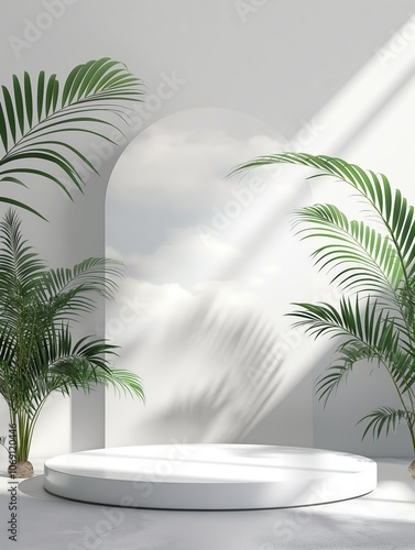 White archway plant vase pedestal clean minimalistic visualisation showcase. AI generated