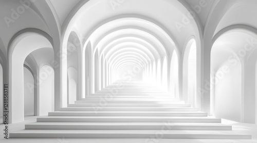 White Archway Tunnel with Steps, Architectural Design, Empty Interior, Light and Space, Stock Photo