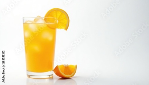 White background with a glass of fresh orange juice and ice cubes, empty, still
