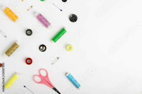 White background with different tools for sewing and tailoring