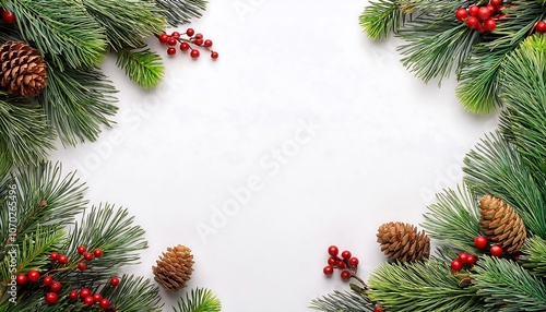 White background with green garlands decorated with red berries and pine nuts placed in the upper and lower corners of the frame.