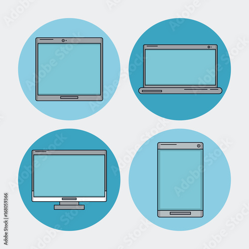 white background with tech device as laptop and desktop computer and tablet and smartphone in blue circles vector illustration