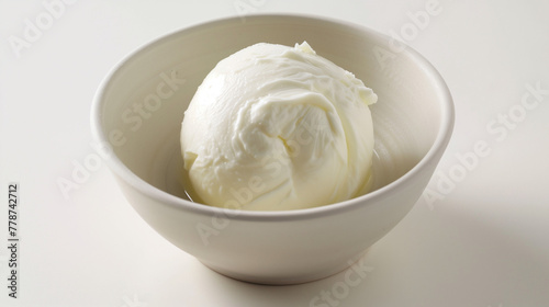 White ball of mozzarella cheese on white background. Smooth surface with light reflection. Design for delicate creamy ravioli filling, purity and freshness concept.