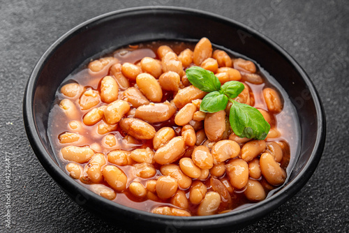 White bean tomato sauce gourmet food background on the table rustic food top view copy space
