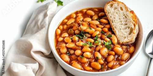White beans with tomato sauce, parsley, and toasted bread in a bowl