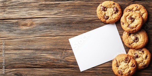 White blank card on rustic wooden background, arranged left of chocolate chip cookies, creating space for text or design in top view.