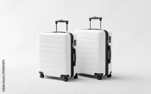 White blank suitcase luggage mockup set, isolated on a white background. Minimalist design with two plastic suitcases standing side by side. High-resolution product photo.