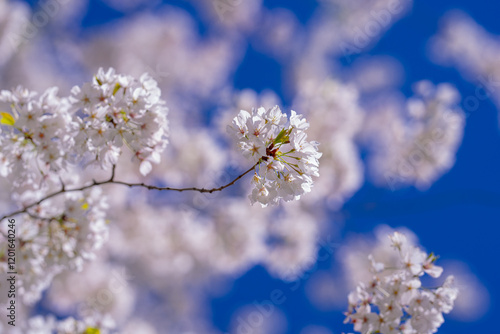 White bloom flowers. Blossom cherry tree on blue sky background. Spring background of bloom tree. Cherry bloom in spring time over blue sky. Flower bloom.