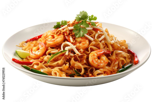 White Bowl Filled With Noodles and Shrimp. On a White or Clear Surface PNG Transparent Background.