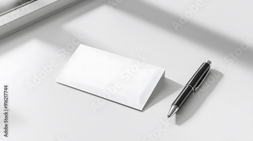 White business card mockup on a clean white table with a single pen beside it