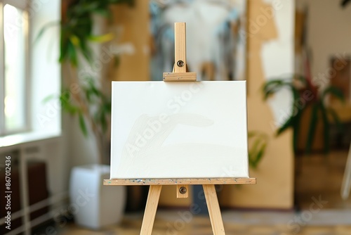 White canvas on a wooden easel in the artist's studio