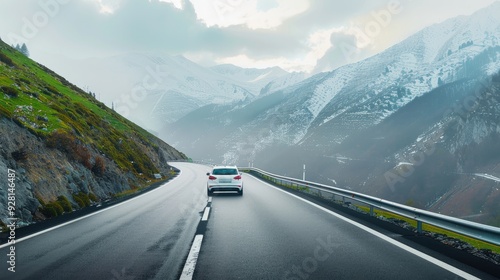 White Car Driving on Winding Mountain Road, Winter Landscape with Misty Hills and Mountain Background