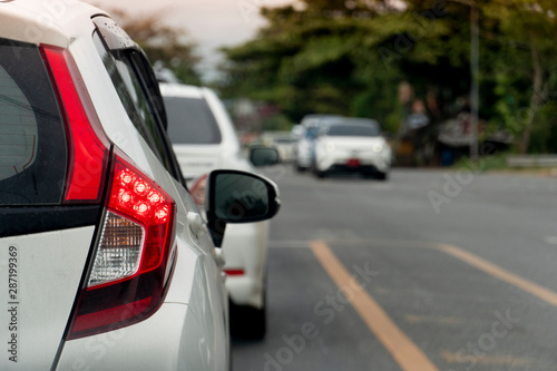 White car on the road in traffic junction there are many cars on the road. With open light brake.