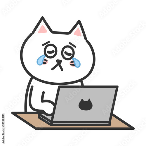 White Cat illustration. Comic. White cartoon cat crying while using a computer, transparent PNG.