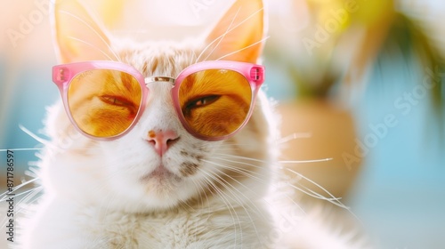 White cat with shades, looking cool focus on flair, dynamic, overlay, sunny patio
